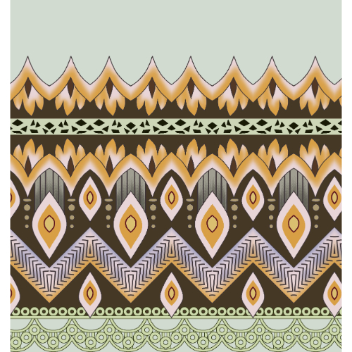 A stylish geometric border textile design featuring layered tribal patterns and decorative motifs. The blend of gold, brown, olive, and soft green tones makes this print ideal for contemporary ethnic and decorative fabrics.