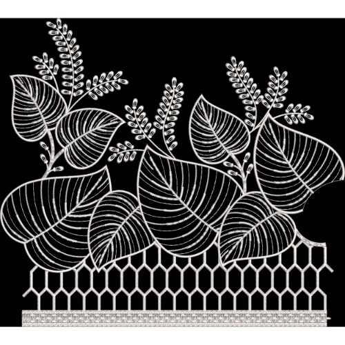 Monochrome Botanical Leaf Border with Geometric Fence Pattern on Black