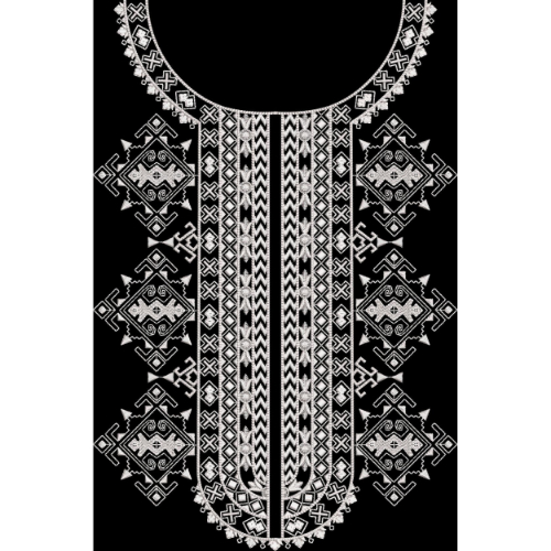 Symmetrical decorative elements are placed on both sides of the central panel, enhancing the balance and ornamental richness of the design. The fine stitch-like detailing gives the artwork a handcrafted embroidery appearance, making it suitable for traditional and contemporary garment designs. This textile print is ideal for kurti and tunic necklines, ethnic wear, abayas, kaftans, and decorative garment panels. The high-contrast monochrome palette ensures clarity and elegance, making it perfect for premium digital textile printing and embroidery-inspired fabric applications.