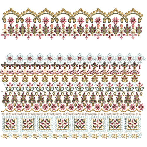 The overall stitch execution demonstrates precise digitizing with balanced density, smooth curvature, and consistent repetition across all rows. This multi-border lace embroidery collection is ideal for bridal wear, lehenga hems, dupatta trims, formal dresses, and couture garments where layered decorative options and intricate ornamental detailing are desired.
