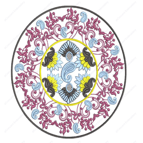 This richly detailed embroidery design features a circular composition that combines floral elements, paisley motifs, and intricate scrollwork in a harmonious arrangement. At the center, a defined circular section contains stylized paisley shapes and floral accents, arranged symmetrically to create a strong focal point. The inner motifs are enhanced with layered stitching and fine detailing, giving them depth and dimension.