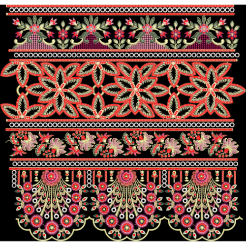 The central portion features bold, large floral patterns formed by overlapping petal shapes outlined in red and filled with textured embroidery-style lines, creating a striking visual rhythm. Below, delicate floral garlands and ornamental bands add refinement and balance to the composition. The lower section is richly adorned with scalloped ornamental motifs and dense floral clusters, giving the design a luxurious and decorative finish.