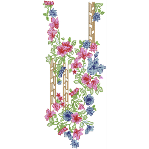 The embroidery showcases a vibrant mix of pink and blue floral motifs with fresh green leaves, beautifully arranged along decorative vertical lattice-style elements. The flowing floral vines combined with structured geometric details create a balanced and eye-catching composition. This design adds a stylish and premium touch to both traditional and modern garments.