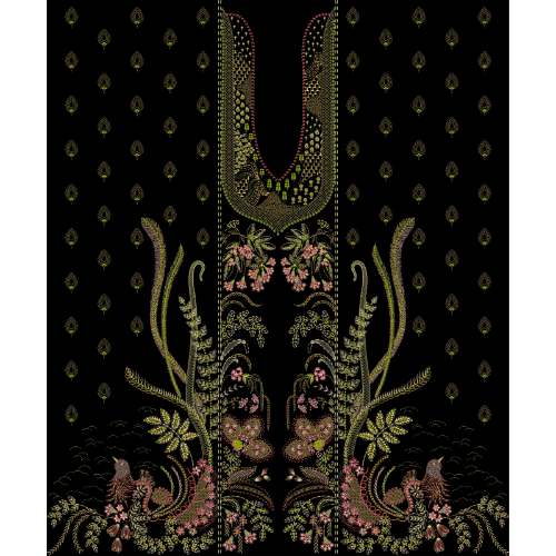 A detailed embroidery-style textile print featuring an ornate neckline, repeating small motifs, and rich floral and ornamental elements arranged in a symmetrical garment panel layout on a black background.