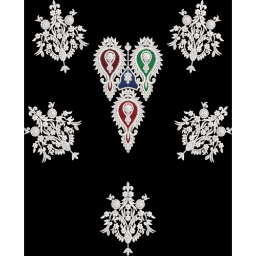 This refined embroidery design presents a central cluster of traditional paisley motifs highlighted in rich red, green, and blue tones, framed with intricate white embroidery outlines. The paisleys are arranged in a balanced triangular formation, giving the centerpiece a classic ethnic appeal. Surrounding the center are six evenly spaced white floral ornamental motifs, each detailed with fine leaves, buds, and curving stems that enhance the overall symmetry and grace of the design.
