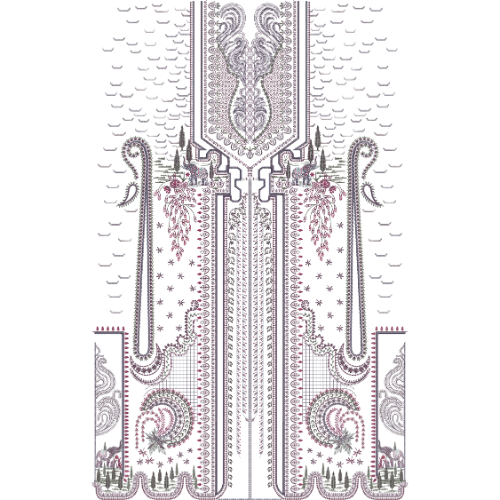 This image presents a highly detailed textile print designed as a full garment panel inspired by traditional embroidery and ornamental architecture. The composition features a central vertical panel filled with dense stitch-like patterns, bordered by symmetrical ornamental frames that guide the eye downward. Paisley motifs, curved flourishes, and delicate dotted textures are integrated throughout the design, creating depth and visual rhythm.