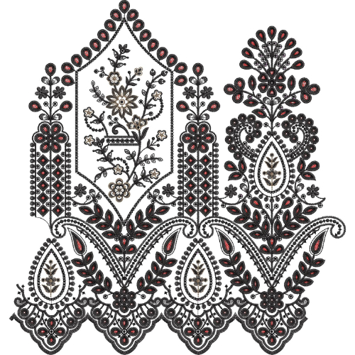 The combination of structured outlines, intricate floral elements, paisley detailing, and scalloped edging reflects advanced lace digitizing craftsmanship. This design is perfectly suited for bridal necklines, formal dress panels, luxury ethnic wear, and couture lace embellishments where elegance and intricate detailing are essential.