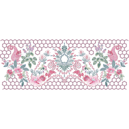 Ornamental Floral Lace Border Embroidery with Honeycomb Background and Bird Motif Detailing