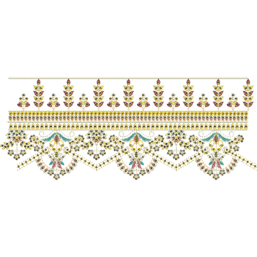 Below the floral stems, a series of ornamental horizontal bands appear, filled with small bead-like embroidery elements arranged in evenly spaced rows. These decorative bands provide structure and rhythm to the border while enhancing the intricate lace aesthetic.