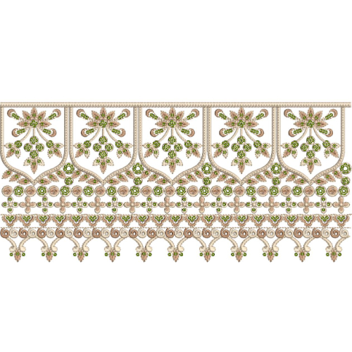 This lace embroidery design features an elegant border composition built around structured shield-shaped motifs, delicate floral arrangements, and an intricately detailed hanging lace edge. The design is arranged in a symmetrical horizontal layout where each section contributes to a refined and ornamental lace pattern.