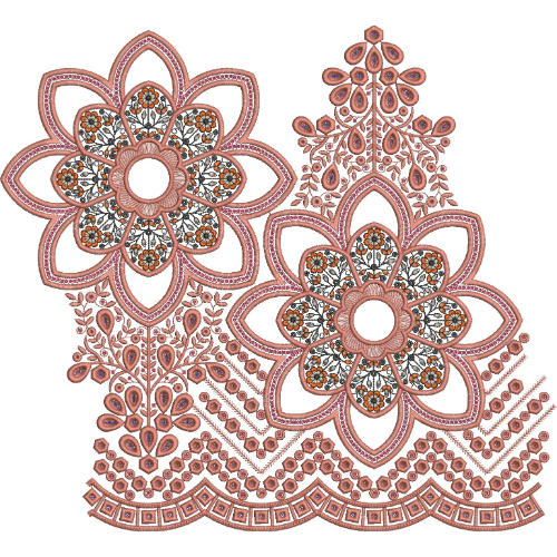 This intricate lace embroidery design features a beautifully balanced arrangement of large floral rosette motifs combined with delicate ornamental detailing. The composition is centered around two prominent flower-shaped medallions that create an elegant and decorative focal structure within the embroidery.