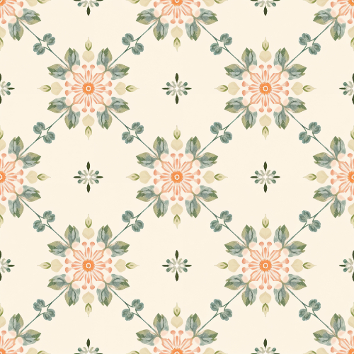 The floral motifs are illustrated in warm peach tones combined with soft sage and muted green botanical elements. These colors create a gentle vintage-inspired palette that enhances the ornamental character of the design. Surrounding the central flowers are stylized leaves and small decorative botanical accents that add depth and detail to the pattern.
