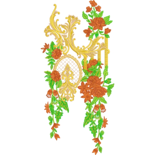 The combination of bold ornamental curves, structured elements, and soft floral detailing results in a sophisticated embroidery design, ideal for elegant and statement neckline applications.