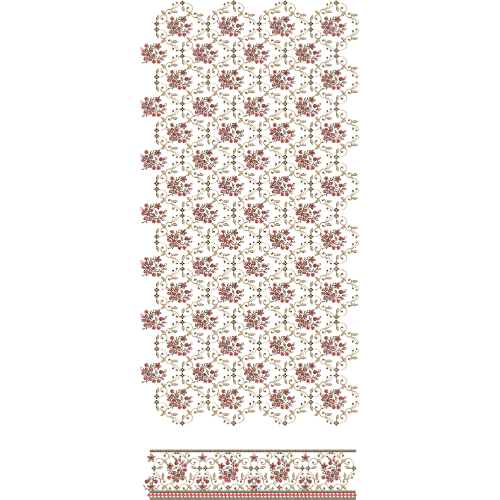 This all-over jaal embroidery design reflects a classic ornamental aesthetic that blends floral elegance with structured lattice detailing. The seamless repetition and coordinated border make it ideal for sophisticated garment surfaces requiring full-coverage embroidery with a timeless and decorative appeal.