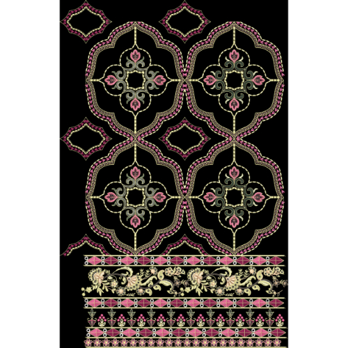 The deep black background enhances contrast, making the embroidery-style details stand out clearly and giving the design a premium, high-end appearance. This textile print is ideal for garment panels, kurtis, dresses, ethnic wear, dupattas, sarees, and luxury fashion fabrics. The high-resolution quality ensures excellent results for digital textile printing and refined fabric applications.