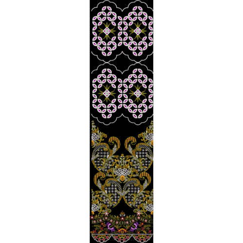 The contrast between the structured geometric patterns above and the ornate floral composition below creates a visually striking and elegant design. The black background enhances the richness and clarity of the colors and fine detailing. This textile print is ideal for decorative garment panels, borders, kurtis, tunics, shawls, scarves, and statement fashion pieces. The high-resolution embroidery-style detailing makes it suitable for premium digital textile printing and sophisticated fabric applications.