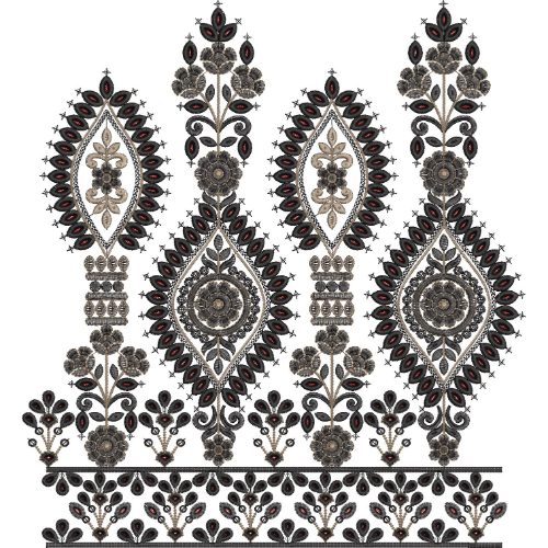 The combination of oval medallions, diamond-centered florals, vertical botanical stems, bead-inspired outlines, and decorative lower banding makes this lace embroidery design ideal for saree borders, dupatta trims, bridal ensembles, formal gowns, and luxury ethnic wear where a richly detailed and elegant lace effect is desired.