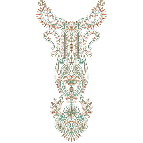 Towards the lower section, the design transitions into a decorative floral arrangement surrounded by smaller paisley and leaf motifs, forming a cohesive and visually appealing base. The layering of elements adds depth and richness, while the overall symmetry ensures harmony throughout the design. This neckline embroidery is ideal for statement garments, offering a refined combination of paisley elegance and ornamental detailing.