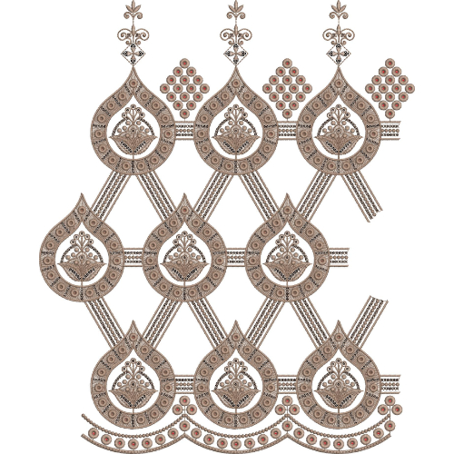 This teardrop medallion lace embroidery design is ideal for saree borders, dupatta edges, formal gowns, kurti hems, bridal wear, and decorative panels where a refined, symmetrical, and richly textured embroidered lace effect is desired.