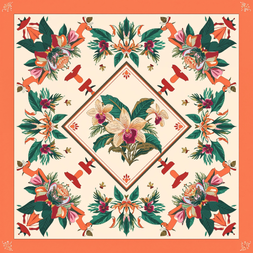 The design is framed by decorative borders and ornamental accents in warm coral tones, giving the pattern a classic scarf-inspired structure. The symmetrical arrangement creates a refined decorative aesthetic reminiscent of luxury textile prints.