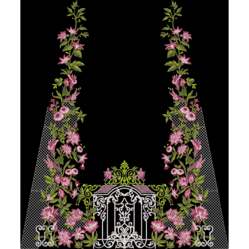 On both sides, tall vertical floral vines rise gracefully, filled with blooming pink flowers, buds, and lush green leaves. Delicate mesh-style embroidery panels run alongside the vines, adding texture and depth while enhancing the couture-inspired appearance of the design. The floral elements are carefully stitched to create a natural flow, guiding the eye upward and giving the panel a regal, elongated silhouette.