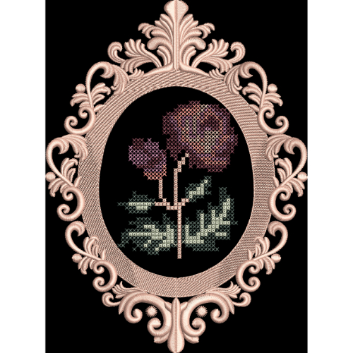 Inside the ornate frame, a delicate floral motif is displayed, composed of a slender stem with small blossoms and textured leaves. The flowers are illustrated in soft pink and muted tones, while the foliage appears in subtle green shades, giving the impression of finely stitched cross-stitch or needlework. The inner floral design contrasts gently with the bold ornamental frame, creating a balanced and refined aesthetic.
