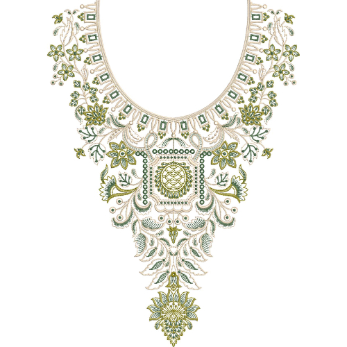This neckline embroidery design features a richly detailed and symmetrical composition built around a rounded neckline and a prominent central decorative panel. The neckline border is enhanced with repeating geometric and bead-like elements, creating a structured frame that adds depth and visual interest. Small floral accents extend outward from the neckline, introducing a soft and organic touch to the upper portion.