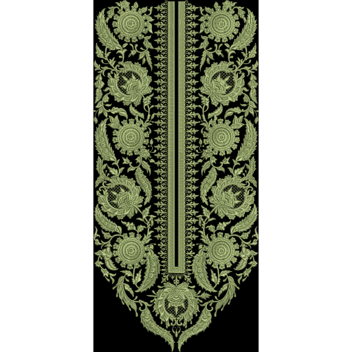 The composition features symmetrical floral and paisley-inspired motifs on both sides of a narrow central vertical panel. The floral elements include detailed blossoms, layered petals, and flowing leaves, rendered in soft olive-green tones that resemble fine thread embroidery. The central panel is bordered with a delicate ornamental pattern, adding structure and balance to the overall design.