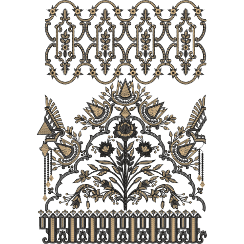 Rendered in a monochrome palette with subtle golden accents, this design feels both classic and luxurious. The detailing resembles traditional embroidery, block printing, or metallic threadwork, making it ideal for premium textile use.