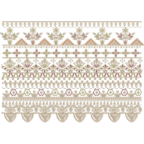 The combination of layered floral bands, geometric motifs, decorative scrollwork, and a detailed scalloped lace edge creates a sophisticated embroidery border suitable for elegant garment embellishments where intricate lace detailing and ornamental richness are desired.
