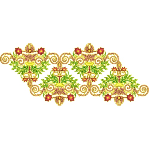 Ornate Multicolor Floral Lace Embroidery Design with Scrollwork and Symmetrical Motifs