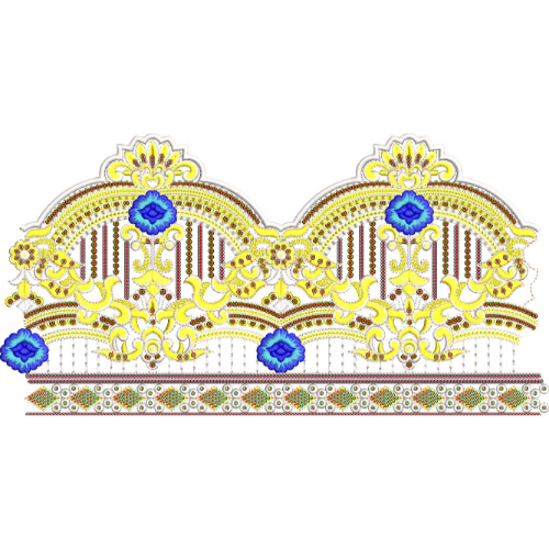 The lower portion is anchored by a narrow decorative border composed of small geometric and floral elements, offering a clean and structured finish. The combination of intricate detailing, layered stitching, and contrasting colors reflects high-quality Wilcom digitizing with precise execution and clarity.