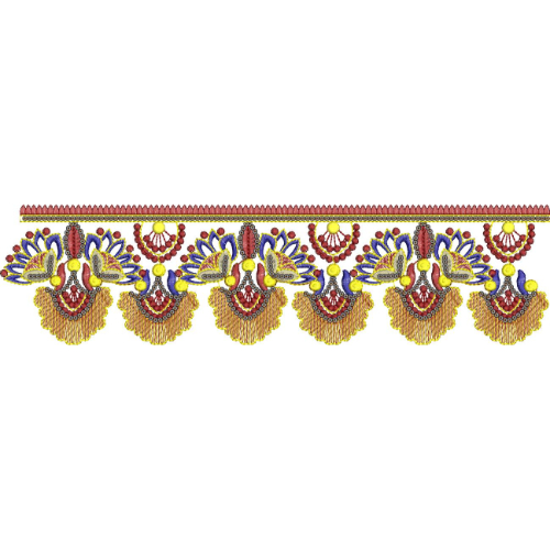 This richly decorative lace embroidery design features a striking combination of floral motifs, bead-like embellishments, and tassel-inspired fringe elements arranged in a repeating scalloped layout. The composition is designed to create a bold and luxurious border with strong visual impact.