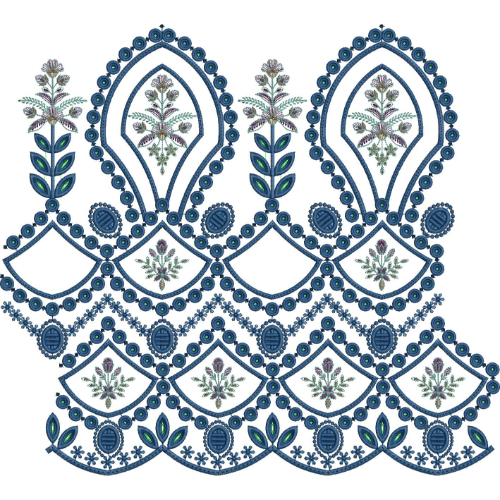 Below the paisley section, a series of curved lace arches are arranged in a repeating pattern. Each arch is decorated with circular lace accents and small oval medallions that add texture and ornamental rhythm to the design. Within the arches, small floral motifs are placed at the center, echoing the botanical style used in the upper section.