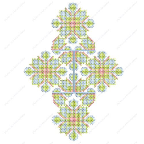 This delicate embroidery design features a soft geometric composition created in a cross-stitch style, forming a balanced and symmetrical arrangement. The design is structured around four primary floral-inspired motifs, each composed of pixel-like stitches that create a textured and handcrafted appearance.