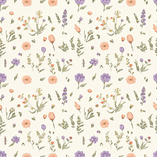 This charming seamless pattern features a delicate collection of wildflowers inspired by natural meadow gardens. The design showcases a variety of small blossoms illustrated in soft pastel tones including peach, lavender, pale coral, and muted violet. Each flower is illustrated in a gentle watercolor botanical style with soft shading and delicate petal details that create a natural hand-painted appearance.