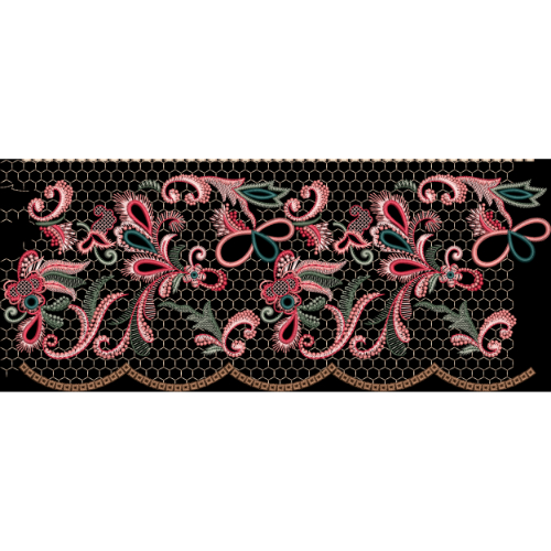 An elegant embroidery-style textile border featuring flowing paisley florals, leafy vines, and a honeycomb lace texture in pink and green tones on a black background.