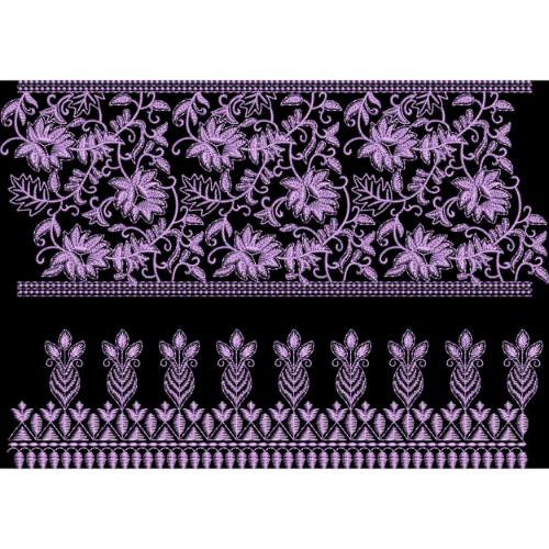 This beautiful embroidery design presents a rich dual-border composition crafted in a soft purple tone against a black background. The upper section showcases an intricate all-over floral vine pattern, where detailed leaves, blossoms, and curling stems are densely interwoven, creating a luxurious and flowing look inspired by traditional hand embroidery. The fine stitch detailing gives depth and texture, making it ideal for statement borders.