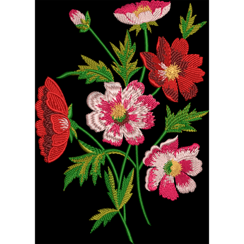 A vibrant embroidery-style textile print featuring red and pink blooming flowers with green leaves and stems, arranged in a natural botanical composition on a black background.