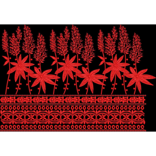 The entire composition is well-balanced, with the bold floral elements complementing the intricate ornamental bands below. Designed in high-resolution 300 DPI illustration format, this embroidery artwork is ideal for garment borders, saree pallav designs, dupatta edges, lehenga hems, kurtis, and traditional or festive apparel. The vivid red threadwork makes it especially suitable for statement fashion pieces and luxury textile applications.