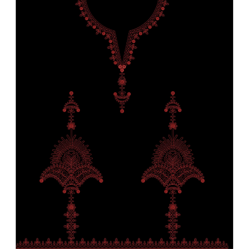 An elegant red embroidery design featuring a detailed neckline pattern with matching symmetrical side motifs and a decorative bottom border.