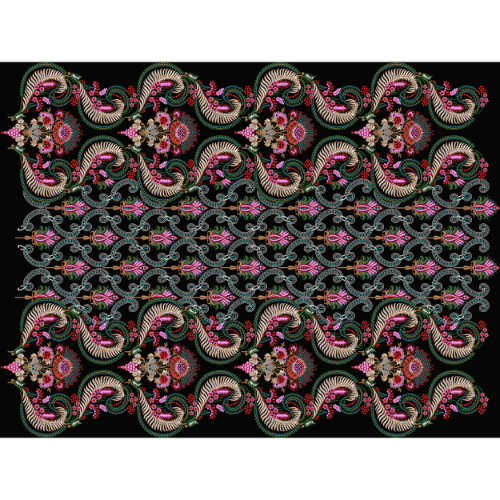Rich Paisley and Floral Embroidery Style Allover Border Textile Print on Black Base