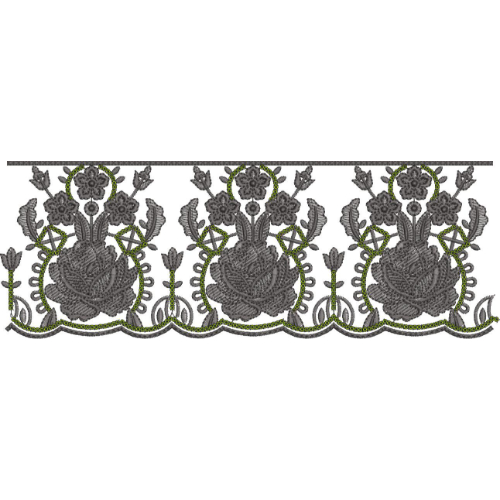 Rose Floral Lace Embroidery Border with Scalloped Edge and Ornamental Vine Detailing