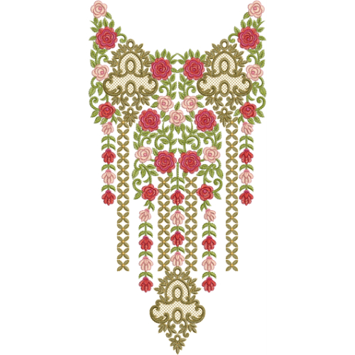 Royal Floral Chandelier Neckline Embroidery Design with Ornamental Gold Pattern and Rose Motifs