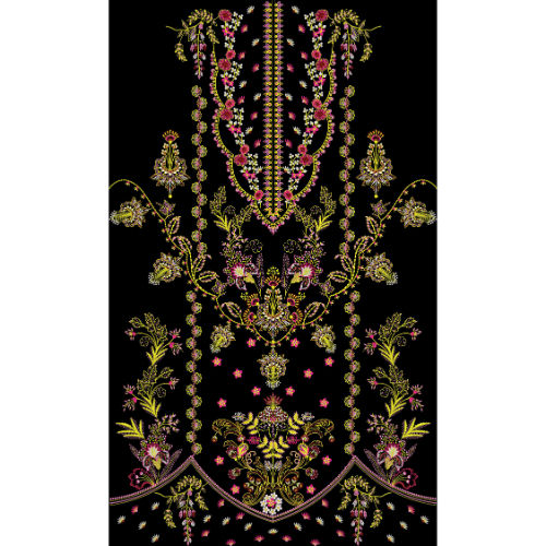 This textile design features a luxurious embroidered-style neckline combined with an elaborate floral and ornamental panel, highlighted with rich gold, pink, and green detailing on a deep black background. Perfect for premium ethnic, bridal, and festive wear.