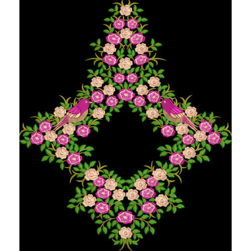 This high-quality royalty free embroidery image showcases a beautifully balanced ornamental embroidery design created on a black background. The design features a geometric diamond-shaped floral arrangement composed of blooming roses, lush green leaves, and two delicately perched birds. Elegant multicolor thread work in shades of pink, cream, green, and purple adds richness and depth to the composition. Fine stitching textures, symmetrical layout, and detailed floral craftsmanship give the embroidery a refined and luxurious handcrafted appearance. Ideal for ethnic garments, decorative panels, fashion embellishments, textile printing, digital embroidery applications, and commercial creative projects. Free for personal and commercial use with no copyright restrictions.