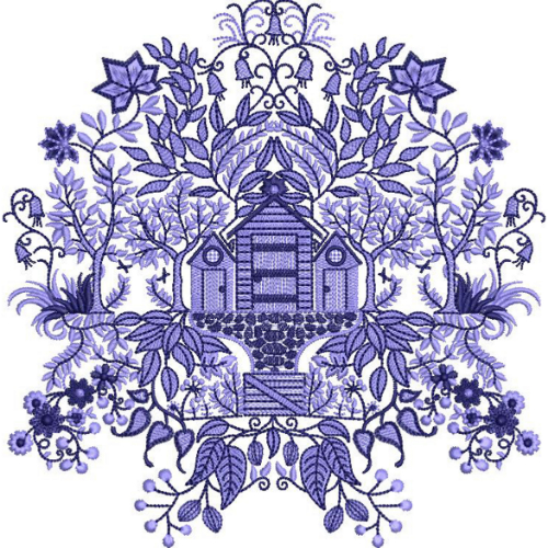 Royalty free monochrome blue embroidery design featuring a charming cottage surrounded by intricate floral and botanical motifs in detailed thread-style artwork.