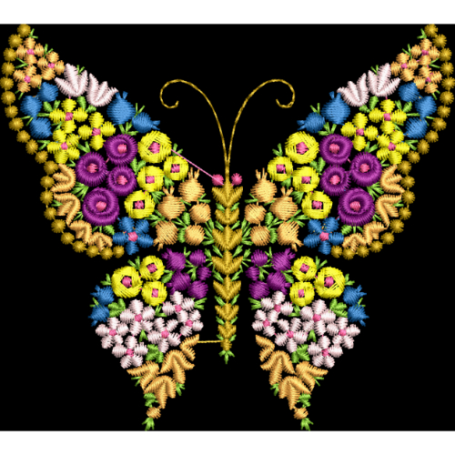 This high-quality royalty free embroidery image features a beautifully detailed butterfly embroidery design composed of vibrant floral and textured stitch patterns. The butterfly wings are crafted using a rich mix of purple, yellow, blue, green, pink, and gold thread work, giving the design a lively and artistic appearance. Fine stitch detailing and layered textures enhance depth and realism, while the black background provides strong contrast to highlight the vivid colors. Perfect for fashion embellishments, kids wear, decorative garments, embroidery patches, digital embroidery designs, textile printing, home décor, and commercial creative projects. Free for personal and commercial use with no copyright restrictions.
