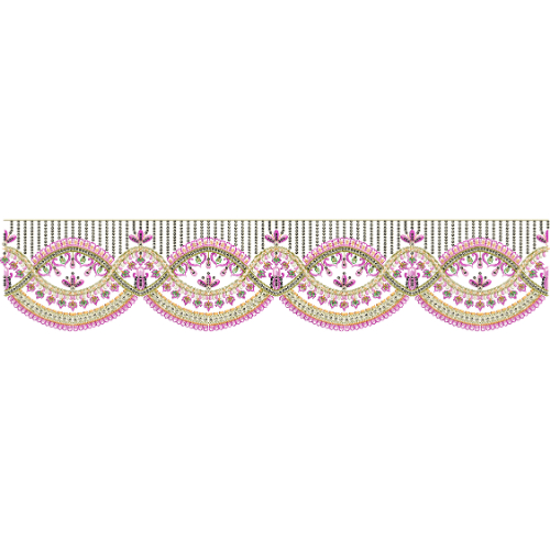 Royalty free decorative floral border embroidery design featuring pink and gold thread work with hanging bead details. Ideal for elegant garment borders and textile projects.