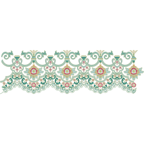 This high-quality royalty free embroidery image features a refined decorative lace border design created with soft pastel thread work on a light background. The embroidery showcases ornate scroll patterns, floral medallions, symmetrical motifs, and scalloped lace edges stitched in soothing shades of green, pink, and cream. Fine detailing and balanced composition give the design a graceful and luxurious appearance. Ideal for women’s apparel, ethnic garments, saree and dupatta borders, fashion embellishments, textile printing, digital embroidery applications, and commercial creative projects. Free for personal and commercial use with no copyright restrictions.